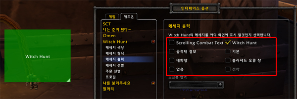 만약 위치헌트의 자리를 옮겼는데도 계속해서 중앙에 메세지가 출력된다면 [메세지 출력] 부분에서 [Witch Hunt]부분에 체크해 주면 됩니다.