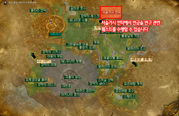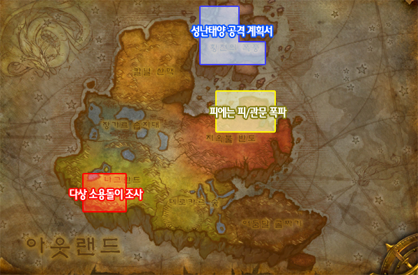 이 중 공격대 지원 퀘스트는 전문기술 중 약초 채집/무두질/채광을 익힌 플레이어만 수행할 수 있습니다. 관문 폭파피에는 피 퀘스트는 1회성 퀘스트인 사라진 마법학자 퀘스트를 완료해야만 수행할 수 있는데 두 퀘스트 모두 짧은 시간 안에 완료할 수 있는 반면 지옥불 반도까지 이동하기엔 귀찮아서인지 가장 인기없는 퀘스트가 되어있는 상황입니다. 아래는 아웃랜드에서 수행하는 퀘스트를 지도에 표시한 것입니다.