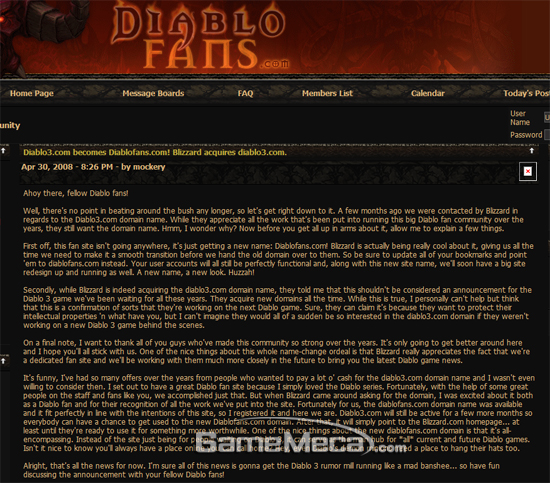 ‘디아블로 시리즈’ 팬 사이트의 ‘디아블로 팬스 닷컴’은 30일 블리자드가 자신들로부터 ‘디아블로3’의 도메인 ‘diablo3.com’을 구입했다고 밝혔다. ‘디아블로 팬스 닷컴’은 사이트 공지를 통해 블리자드가 수 개월 전부터 도메인 구입 건으로 자신들과 접촉해왔으며, 5월 1일 부로 ‘diablo3.com’의 소유권이 블리자드로 넘어갔다고 밝혔다.  `디아블로 팬스 닷컴`은 그동안 ‘www.diablo3.com’을 주소로 써 왔으나 블리자드가 이 도메인을 구입함으로서 ‘diablofans.com’으로 주소를 이전했다. 이 과정에서 블리자드는 ‘디아블로 팬스 닷컴’에게 시간적, 물질적 배려를 한 것으로 알려졌다. 현재 ‘diablo3.com’은 ‘diablofans.com’과 연동되고 있는 상태다.