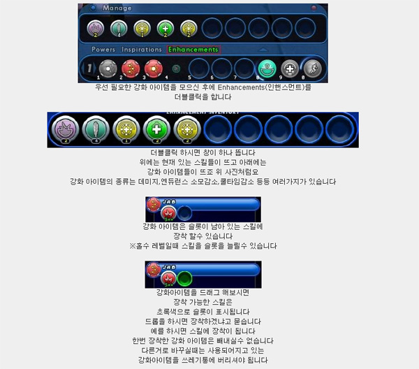 시티 오브 히어로/빌런은 현재 국내 서비스가 중단된 비운의 게임입니다. 이 게임에서는 사실상 장비로 강해진다는 부분이 없으며 강화 아이템을 사용해 해당 스킬의 피해량, 재사용 대기시간 감소 등등의 효과를 부여하는 것이 캐릭터가 강해지는 유일한 방법이라고 합니다.