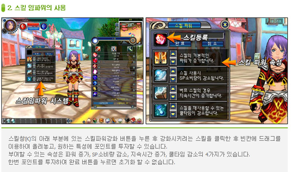 피에스타 온라인은 예전에 카툰 풍의 그래픽을 바탕으로 한 MMORPG입니다. 피에스타에서는 액티브형 스킬에 2레벨 마다 1씩 주어지는 포인트를 사용하여 자신의 스킬에 부가 효과를 적용시키는 스킬 임파워 시스템을 만나볼 수 있죠.