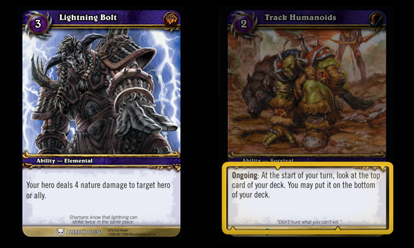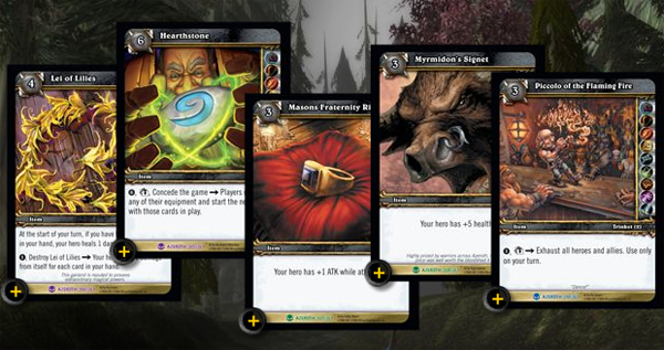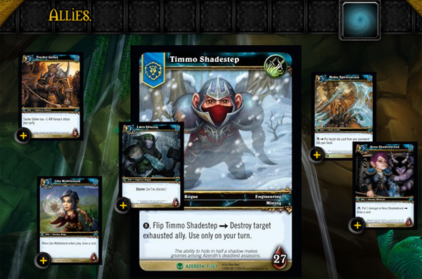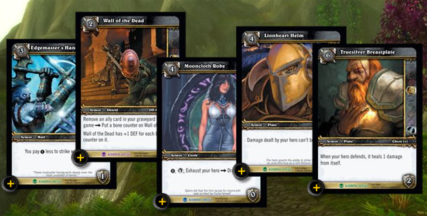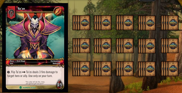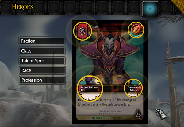 영웅 카드는 플레이어를 대신하는 카드이자 파티의 리더입니다. 영웅 카드에는 해당 영웅의 이름과 특징이 표시되어 있고 뒷면에 와우TCG로고 대신 해당 영웅의 일러스트가 그려져 있어서 다른 카드들과는 구분됩니다.