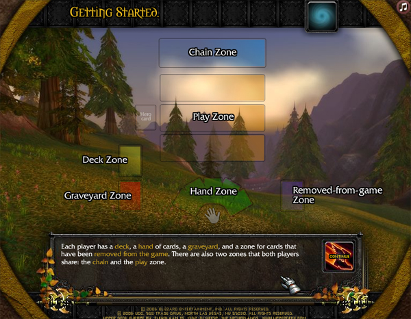 핸드 존은 플레이어가 손에 들고 있는 카드를 의미합니다. 적에게 보여주어서는 안되겠죠? 덱 존에는 물론 자신의 덱이 자리잡으며 어떤 카드가 위에 있는지 알 수 없도록 뒷면으로 둡니다. 플레이 존과 체인 존은 게임이 직접 펼쳐지는 장소로 자신의 영웅 및 동맹에게 착용한 장비 카드를 둘 수도 있고 지속 기술(와우의 버프라고 생각하면 됩니다)을 둘 수도 있습니다. 무덤은 자신이 소비한 카드나 전투에서 사망한 동맹 카드를 두는 곳으로 어떤 카드인지 알 수 있도록 앞면으로 둡니다. 플레이 존은 다시 동맹 지역, 영웅 지역, 자원 지역으로 분류됩니다. 동맹 지역에는 자신이 초대한 동맹과 해당 장비 카드가 자리잡고 영웅 지역에는 영웅에게 착용시킨 장비나 지속 기술 카드가 자리잡습니다. 자원 지역에는 자신이 내려놓은 자원과 퀘스트 카드가 자리잡게 됩니다. 게임 제외 존은 현재 게임에서 사용될 수 없는 카드를 두는 곳으로, 게임에 아무런 영향을 주지 못합니다.