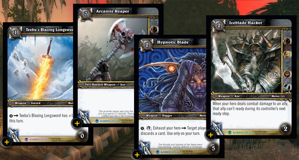 맨몸으로 싸우기에는 적이 너무 강력하죠. 그래서 각종 장비 카드가 존재합니다. 이를 장착하거나 사용하기 위해서는 동맹을 고용할 때와 마찬가지로 자원을 지불해야 하며, 직업 및 특성이 해당 영웅/동맹 조건에 맞아야만 합니다.