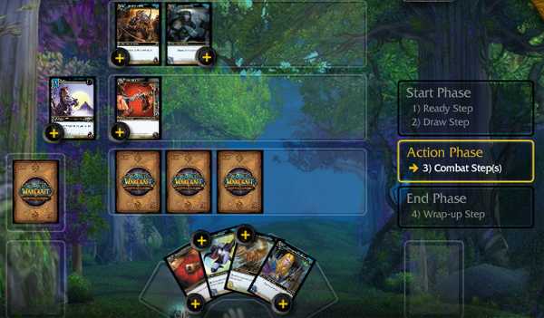 게임을 준비하기 위해서는 앞서 말한 덱과 넉넉한 공간만 있으면 됩니다. 물론 자신을 상대해 줄 플레이어가 있다면 더욱 좋겠죠. 게임을 시작하게 되면 덱을 여러 번 섞은 다음에 위에서부터 7장을 드로우(덱의 카드를 핸드 존으로 가져오는 것)합니다. 만약 처음 시작할 때 자신의 손에 들어온 카드가 마음에 들지 않는다면 한 번은 다시 섞어서 뽑는 것이 가능하니 참조하세요. 부가적으로 필요한 것이라면 영웅이나 동맹이 받은 피해를 표시할 만한 도구(구슬이나 단추, 메모지 등등)를 준비해서 자신의 캐릭터들이 받은 피해를 기록해야 한다는 점입니다. 턴이 끝난다 해도 영웅의 체력이 회복되는 것이 아니기 때문이죠. 와우 TCG의 턴은 크게 세 단계로 구성되며 일부 단계는 스텝으로 나누어집니다.