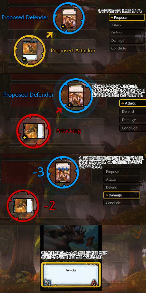 기본 전투는 크게 선언, 공격, 방어, 피해, 종료의 다섯 단계로 나누어집니다. 각 단계에 대한 설명은 아래 그림을 참조하세요.