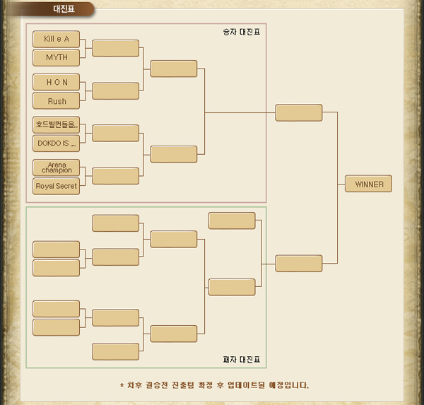 보도자료: 블리자드 코리아 2008. 8/26 안녕하세요, 와우저 여러분. 지난 3월 27일 1차 온라인 예선전을 시작으로, 지난 7월 17일 2차 예선전 종료까지 성황리에 진행되었던 2008 월드 오브 워크래프트 아레나 토너먼트의 온라인 예선 일정이 모두 종료되어, 이제 한국 지역 결승전만을 남겨 두고 있습니다. 이번 2008 아레나 토너먼트 한국 지역 결승전에는 1차 예선전을 통과한 4개 팀과 2차 예선전을 통과한 4개 팀이 최종적으로 결승전에 진출하여, 총 8개 팀이 한국 지역 3대3 최고 승자의 영예를 놓고 치열한 승부를 펼치게 됩니다. 2008 월드 오브 워크래프트 아레나 토너먼트의 한국 지역 결승전은 2일에 걸쳐 진행되며 각각의 일정 및 장소는 아래와 같습니다. ■ 8강전 ~ 4강전 (패자조 경기 포함) - 일정 : 2008년 8월 30일 ■ 4강전 ~ 최종 결승 (패자조 경기 포함) - 일정 : 2008년