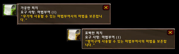 마법부여는 기존의 마법부여 효과에 비교했을 때 새롭다고 할 만한 부분은 없습니다. 하지만 주문각인으로 제작하는 [가공한 피지]와 [표백한 피지]에 마법을 부여해서 경매장에 판매할 수 있다는 점은 많은 이들의 눈길을 끌 것 같군요.