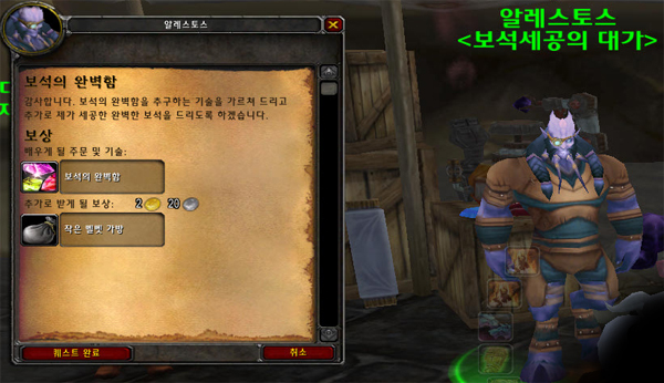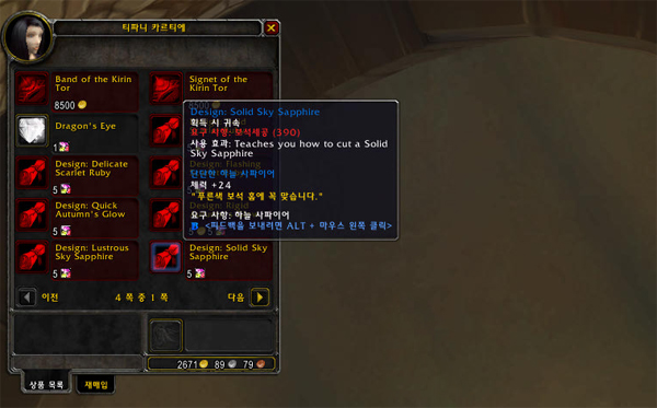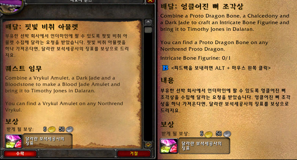 보석세공사를 위한 일일 퀘스트도 존재합니다. 달라란의 티모시 존스로부터 받은 일일 퀘스트를 수행하면 [달라란 보석세공사의 징표]를 획득할 수 있는데요 이 징표는 보석세공사만을 위한 보석을 만들 수 있는 재료와 디자인을 구입하는 데에 사용됩니다.