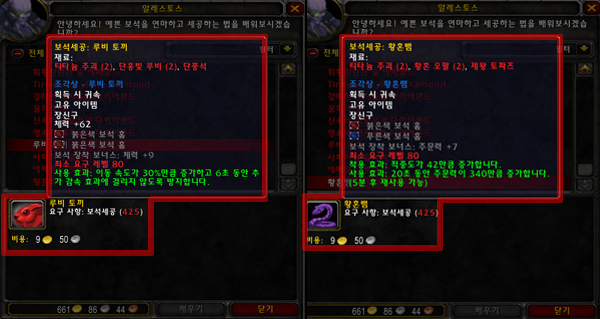 이 중 허리에 보석 홈을 만들 수 있는 티타늄 벨트 버클은 영웅 등급의 아이템으로 제작하는 것이지만 다른 세 개는 마법부여처럼 해당 아이템에 직접 보석 홈을 뚫어주는 기술입니다.