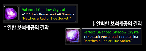 완벽한 보석과 일반 보석의 차이점은 당연히 보석의 효과 증대에 있습니다. 아래 그림에서 알 수 있듯이 완벽하게 세공된 보석은 보통의 보석보다 스탯이 1~2가량씩 높기 때문에 같은 재료로 보석을 세공한다면 완벽한 보석이 되길 바라는 것이 당연한 이치겠죠?