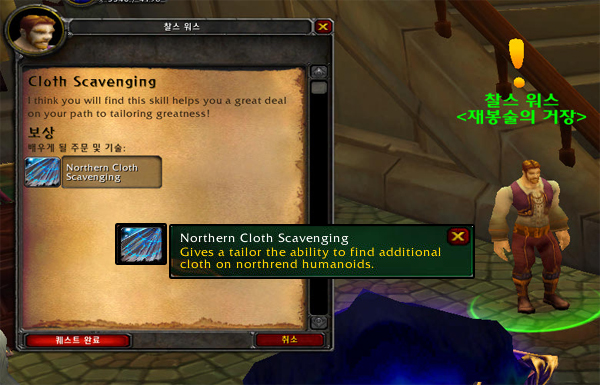마지막으로 재봉술과 관련하여 소개시켜 드릴 내용은 재봉술만의 지속 효과인 옷감 획득확률 증가입니다. 재봉술의 거장 NPC와 간단한 대화를 한 뒤 5골드를 지불하면 완료할 수 있는 퀘스트인데요 옷감을 대량 소비해야 하는 재봉사에겐 필수가 아닐까요?
