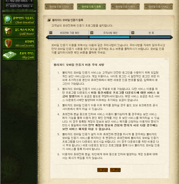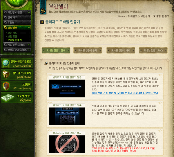 블리자드 모바일 인증기는 월드 오브 워크래프트 로그인 시 아이디, 비밀번호 입력 이외에 휴대전화를 통해 수시로 변경되는 인증번호를 발급받아 사용하는 강화된 보안 서비스로써, 휴대전화로 보안 프로그램을 다운로드 받아 이용하실 수 있습니다. - 프로그램 다운로드 시 프로그램 다운로드 및 데이터 전송을 위한 통신 요금이 각 이동통신사 별로 부과될 수 있습니다. 프로그램 설치가 완료되어 인증번호가 정상적으로 표시된 이후에는 별도의 이용요금 없이 사용하실 수 있습니다. - 터치폰 및 일부 휴대전화 단말기의 경우 블리자드 모바일 인증기 다운로스 서비스가 제공되지 않을 수 있습니다. 해당 단말기에 대한 서비스는 곧 제공할 예정이며, 사용하고 계신 휴대전화의 서비스 지원 여부는 아래 등록 페이지에서 확인하실 수 있습니다. 블리자드 모바일