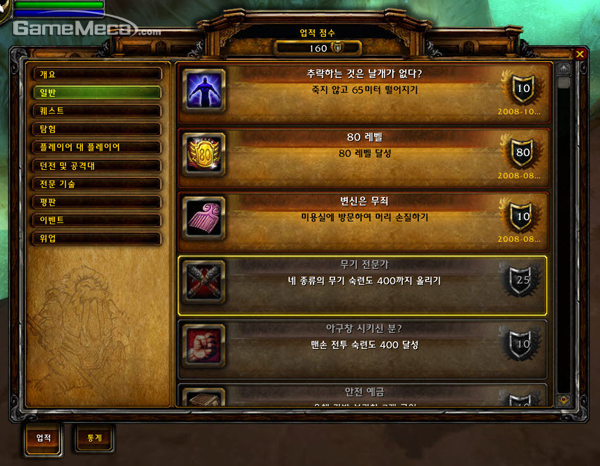 ‘자신이 성취한 업적이 게임 내에 기록된다.’ 새롭게 추가되는 시스템 중에 다양하면서도 여러 가지 재미를 추구할 수 있는 기능 중에 하나가 업적 시스템이다. 퀘스트, 탐험, 플레이어간의 전투 등 게임 내에서 진행되는 다양한 모험 중에 자신만의 기록을 세우고 남에게 그 위용을 과시할 수 있는 시스템으로 플레이어들이 게임을 즐기면서 자신만의 독특한 스타일을 창조하는데 큰 역할을 하게 된다 [월드 오브 워크래프트 업적 시스템