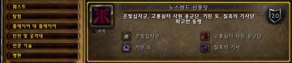 자 이제 은빛십자군, 고룡사원 쉼터 용군단, 키린 토, 칠흑의 기사단의 평판을 올리려면 어떻게 해야 하는지 알아보자. 위의 평판은 `불타는 성전` 처럼 정해진 인던이 존재하지 않는다. 그럼 어떻게 평판을 올리라는 걸까? 해답은 바로 해당 세력의 휘장에 있다.