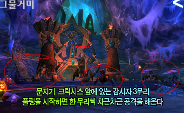 크릭시르는 아졸네룹 입구에서 바로 볼 수 있는 보스다. 이 녀석은 감시자 세 무리와 세트를 이루고 있기 때문에 한번 풀링을 시작하면