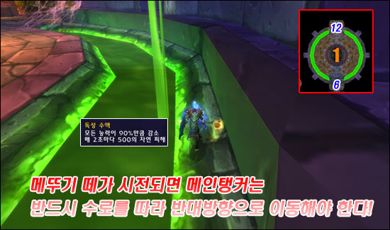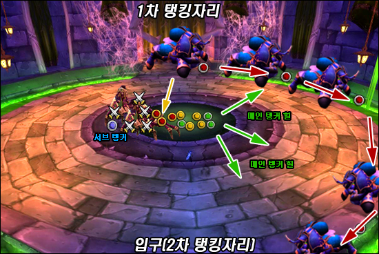 (1) 메인 탱커: 근접 딜러의 반대 방향에서 자리를 잡고 탱킹한다. 아눕레칸이 메뚜기 떼 스킬을 시전하면 수로를 따라 반원을 그리며 2차 탱킹 자리로 뛰어가야 한다.