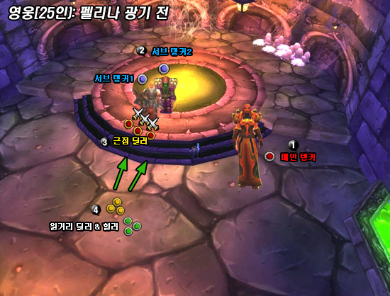 (2) 서브 탱커: 단상 위에서 숭배자 4명을 모두 탱킹한다. 메인탱커와 마찬가지로 랜덤으로 시전되는 불의비에 맞지 않도록 이동 탱킹을 한다. 광기 10초전 미리 펠리나의 근처로 이동한다.