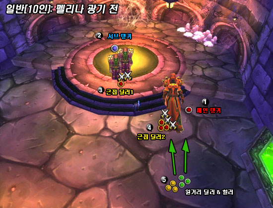 일반(10인): 메인탱커1(펠리나), 서브탱커1(숭배자 4명), 힐러2-3(메인탱전담1, 서브탱커-공대원                    전담 1-2), 딜러 5-6(밀리,원거리)