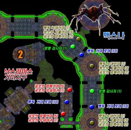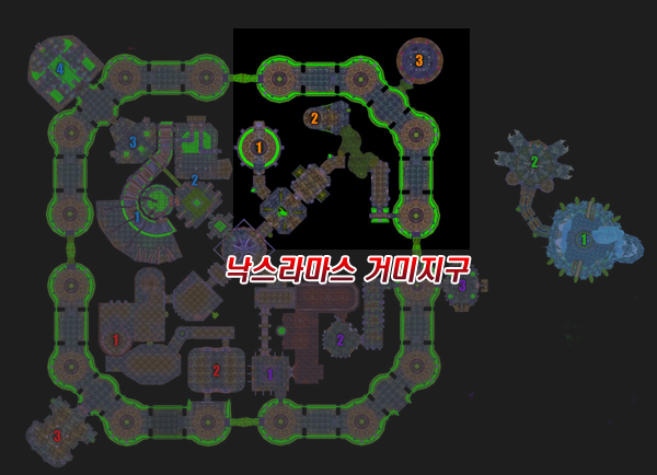 낙스라마스는 거미, 역병, 피조물, 군사,서리고룡의 총 5개 지구로 나누어져 있다. 서리고룡을 제외한 4지구는 아무곳이나 먼저 갈 수 있으며, 일반적으로 난이도가 가장 낮게 설정된 거미지구를 먼저 공략하는 편이다. 거미지구는 아눕레칸, 펠리나, 맥스나 총 3개의 네임드로 구성되어 있으며 짧은 시간 내에 클리어 할 수 있다.