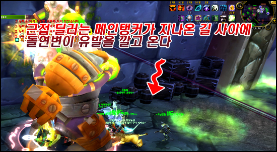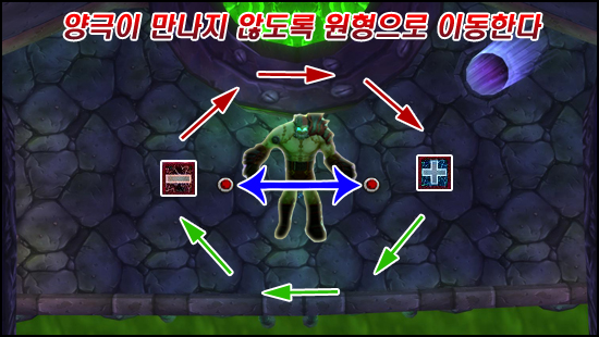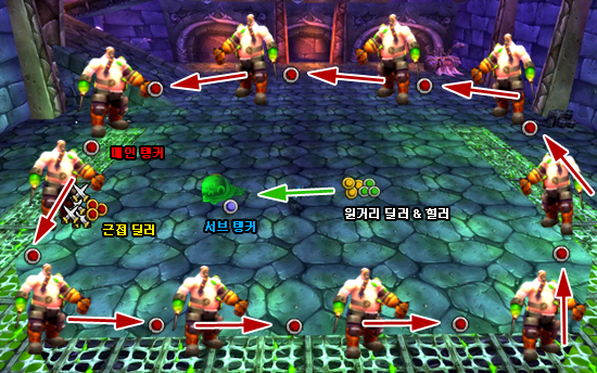 탱커가 독을 피해 이동하다보면 12시 방향에서(이미지기준) 탱킹을 하는 경우가 생기는데, 원거리 딜러, 힐러는 반대로 6시쪽에 독을 깔고 본진으로 돌아오면 된다. 결과적으로,