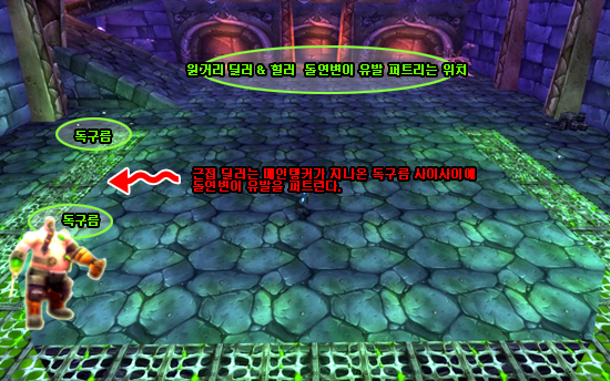 돌연변이 유발이 걸린 근접 딜러는 이미지와 같이 메인탱커가 지나온 독구름 사이사이나 좀 옆의 구석진 곳에 독을 깔고 다시 그라불루스의 딜링을 시작한다. 원거리 딜러, 힐러는 본진과 메인탱커 반대 방향의 장소에서 돌연변이 유발의 독을 깔고 다시 본진으로 돌아온다.