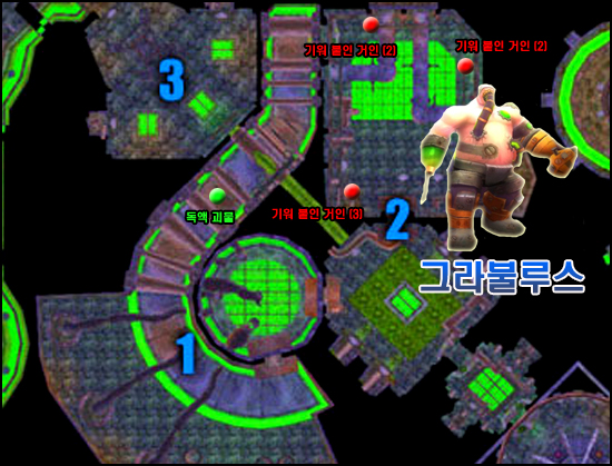 (3) 근접 딜러: 그라불루스의 뒤쪽에서 딜링을 시작한다. 독액 뿌리기에 맞는 만큼 독액괴물이 나오기 때문에 메인탱커를 제외한 모든 근접딜러는 메인탱커의 반대편(주로 뒤쪽)에서 자리를 잡고 공격해야 한다. 돌연변이 유발에 걸릴 시 메인탱커가 지나온 독구름 사이사이에 터뜨리고 온다.