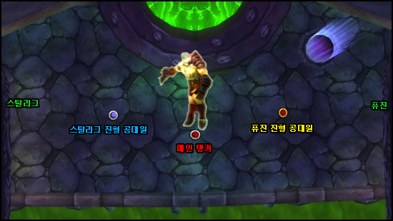 (1) 메인 탱커: 전투가 시작되면 메인탱커는 위 이미지처럼 계단 밑에서 탱킹을 시작한다. 매 15초마다 시전하는 독구름을 피해야하기 때문에 그라불루스가 독구름을 시전하면 메인탱커는 피해를 입지 않을만큼 뒤로 이동하고 다시 탱킹을 시작한다.