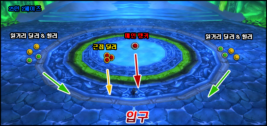 힐러2-3(메인탱커 담당1-2, 공대원 담당1,저주해제 담당 회복드루 혹은 복원술사)
