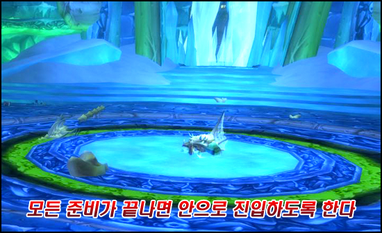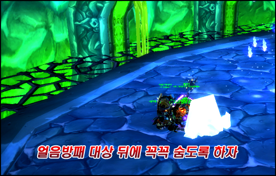 영웅(25인) 던전 얼음 방패는 총 3개가 생기기 때문에 6시 방향으로 이동 중 양쪽에 방패가 하나씩 생기면 이동을 멈추고 얼음 방패 뒤로 숨는다.