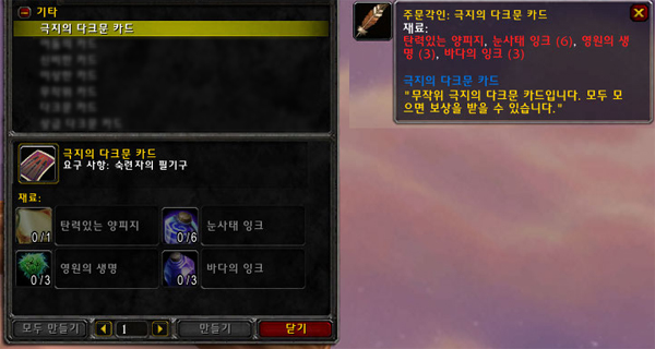 문제라면 [극지의 다크문 카드]제작에 들어가는 재료가 만만찮다는 것과 결과물이 무작위로 나온다는 데에 있습니다. 운이 없다면 [불사 6]카드만 10장씩 나올 수도 있는것이죠.