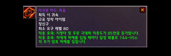 [다크문 카드: 죽음]은 노스렌드 다크문 카드 중 [불사 A]~[불사 8]까지를 모아 완성하는 아이템입니다. 효과는 보시다시피 딜러에게 적합한 것이죠. 노스렌드에는 이와 비슷한 효과의 장신구가 상당히 많은 편이라 같은 계열의 장신구를 놓고 고민하는 경우가 있을겁니다. 딜러라면 조금이라도 높은 DPS를 확보하고 싶은 것이 보통이니까요. 처음 죽음 카드가 나왔을 땐 착용 효과가 가속도 증가여서 외면받았었지만 3.0.8 패치 이후에 치명타 및 주문 극대화 적중도로 변경되어 재조명되고 있습니다. 플레이어들의 테스트에 의해서 알려진 사실로는 죽음 카드의 발동은 45초의 히든 재사용 대기시간이 존재하며 발동 확률은 약 35%이지만 체감상 45~46초마다 발동된다고 합니다. 특히 마법사의 얼음불꽃 화살, 작렬, 흑마법사의 부패, 제물 등 도트 효과들에 의해서도 발동되기에 재사용 대기시간이 지나면 매번 발동된다고 보아도 무방하겠죠. 주문력에 영향을