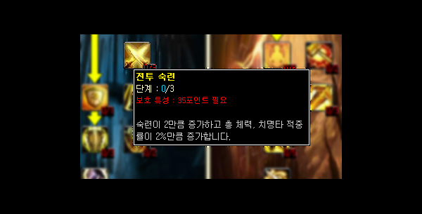 숙련은 불타는 성전의 패치였던 2.3.0을 통해 처음 소개되었습니다. 이 옵션의 역할은 대상이 회피하거나 막을 확률을 감소시켜 주는 것이죠. 무기 숙련도와는 다르게 특정 무기의 종류에 한정된 것이 아니기에 근접 관련 옵션 중에서는 최고의 옵션이라 할 수 있습니다.