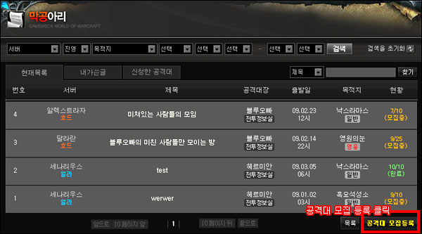 ▲ 단계1, 공격대 모집 등록을 클릭합니다