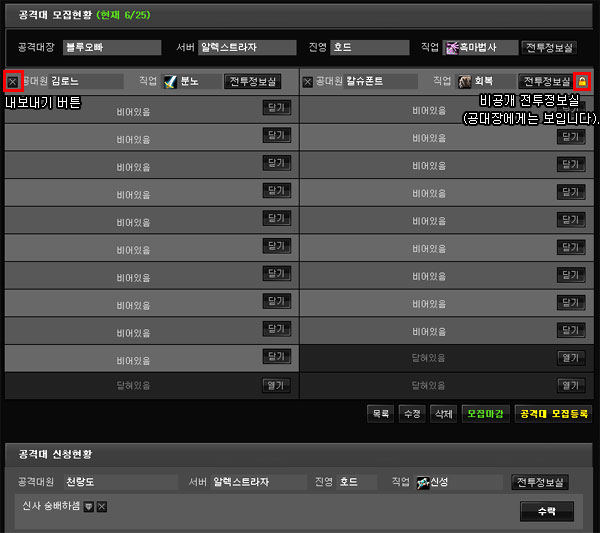 ▲ 단계4, 유저들이 공격대 신청을 하면 `수락` 버튼을 눌러 공대원으로 받습니다.