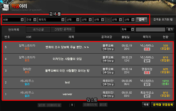 ▲ 단계1, 검색 툴을 이용해 내 조건에 맞는 공격대를 찾습니다.