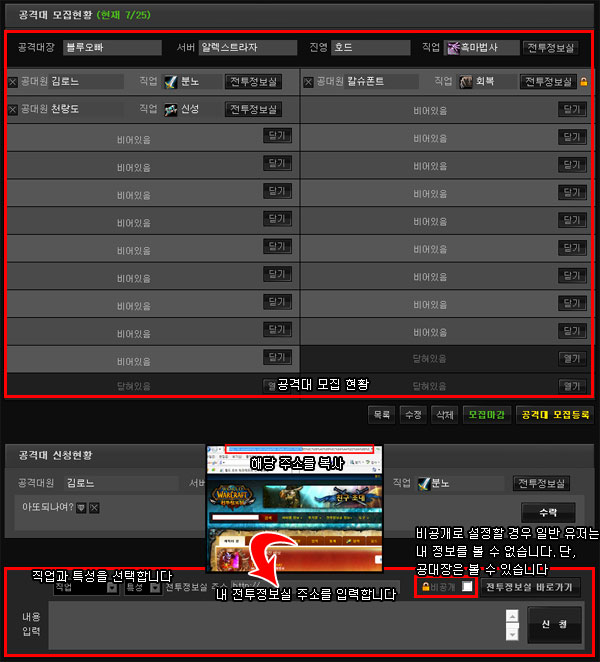 ▲ 단계2, 원하는 모집 글에 직업과 특성, 그리고 전투정보실 주소를 넣고 신청합니다