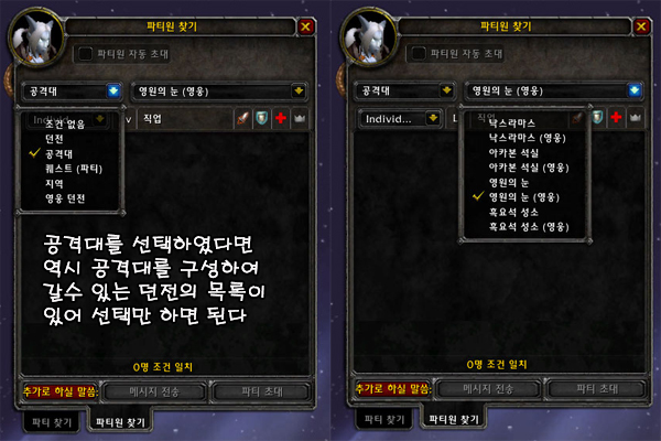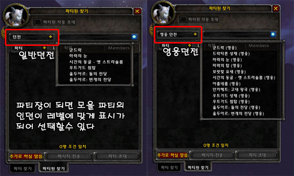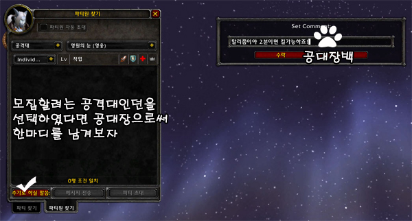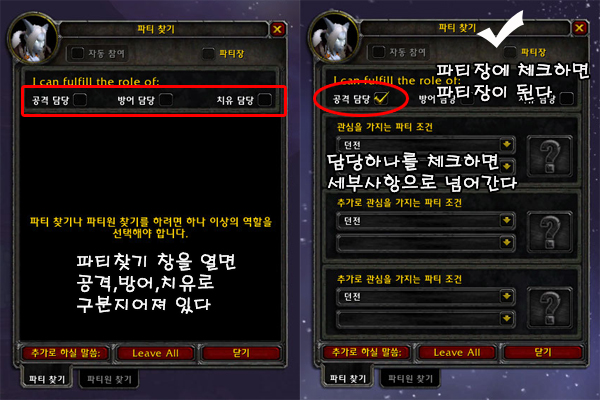 파티 찾기 기능 또한, 파티 및 공격대에서 수행할 역할을 선택할 수 있도록 업데이트되었습니다. 이제 파티 찾기 창을 열면 공격, 방어, 치유 담당 중 자신이 맡고자 하는 역할을 선택할 수 있고, 파티장이나 공격대장 수행 여부도 선택할 수 있습니다. 또한 파티원 찾기 탭에서는 파티에 필요한 역할로 플레이어를 정렬할 수 있습니다.