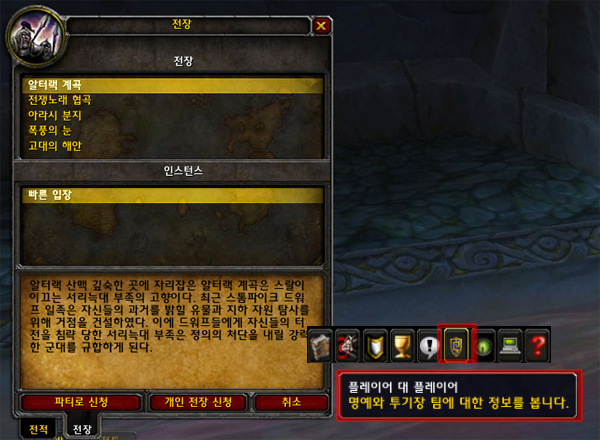 플레이어 대 플레이어 인터페이스에 있는 ‘전장’ 탭을 통해 어디에서든 전장 대기열에 자신의 이름을 올릴 수 있습니다. 전투가 끝나면 플레이어들은 전장에 진입하기 전에 있었던 위치로 돌아갑니다.