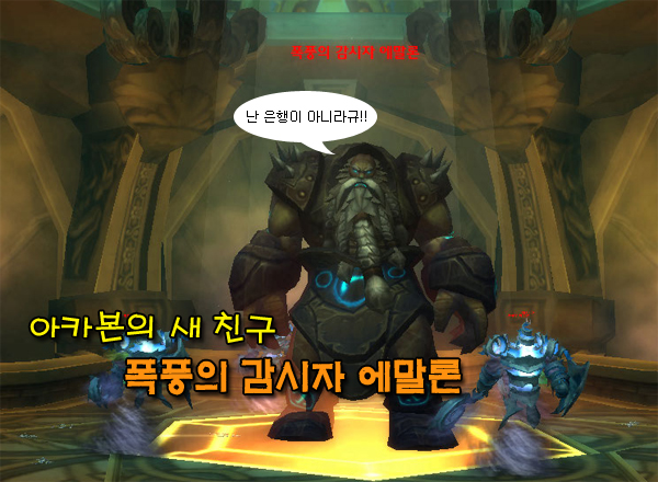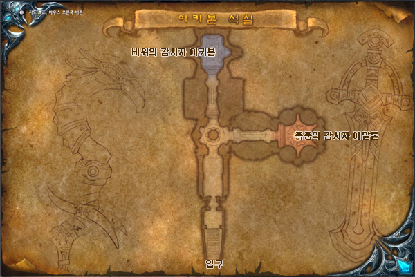 바위 감시자 아카본의 새로운 친구 폭풍의 감시자 에말론이 아카본 석실 한 구석에 돗자리를 폈습니다. 아카본만 있던 아카본 석실에도 에말론을 위한 리모델링을 하여 새로운 지도가 만들어졌습니다. 기존 외길이었던 아카본 석실에 벽을 뚫고 길을 내어 에말론만의 위한 공간을 만들었으니 지도를 보시고 에말론을 못 찾아 미아가 되지 마시길 바랍니다.