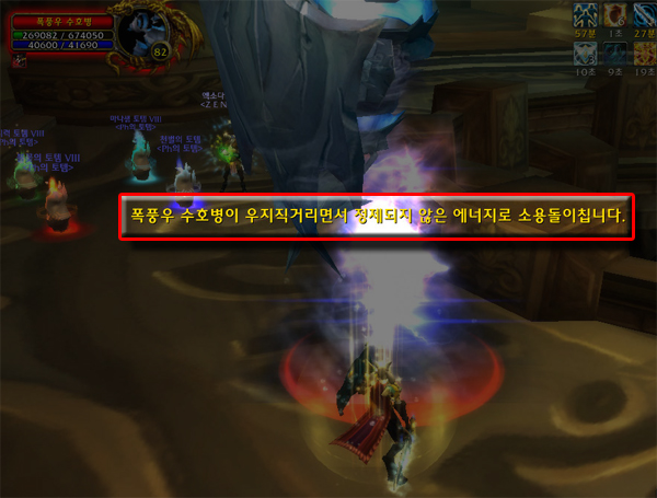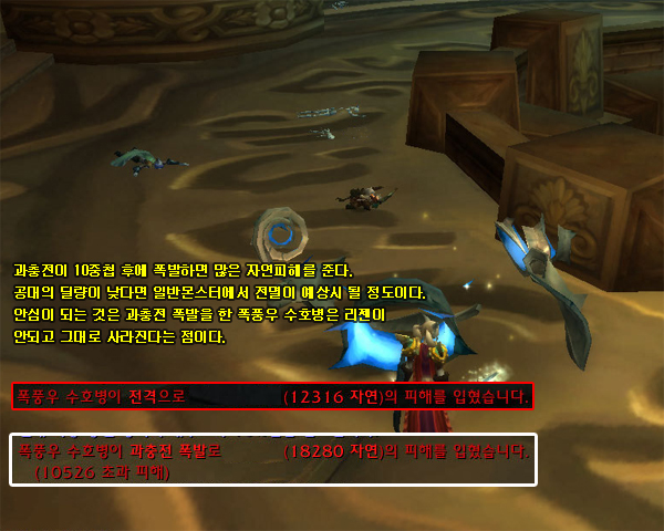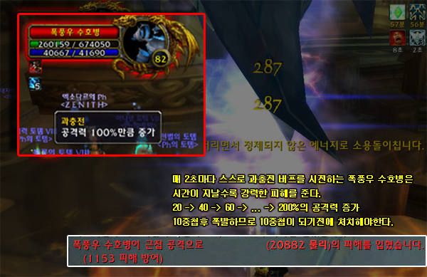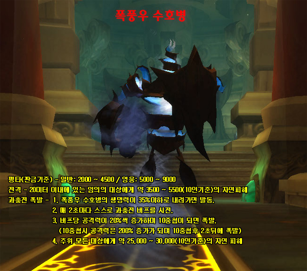 폭풍우 수호병 공략의 핵심은 생명력이 35%이하로 내려가면 스스로에게 시전하는 과충전 버프가 10중첩이 되기 전에 빠르게 처리하는 것입니다. 낙스라마스 역병지구에 있는 돌가죽 가고일과 같은 방식이라고 생각하면 됩니다. 차이가 있다면 돌가죽 가고일은 생명력이 회복되지만, 폭풍우 수호병은 스스로 폭발하여 주위 모든 대상에게 25,000~30,000(10인기준)의 피해를 준다는 게 다를 뿐입니다.