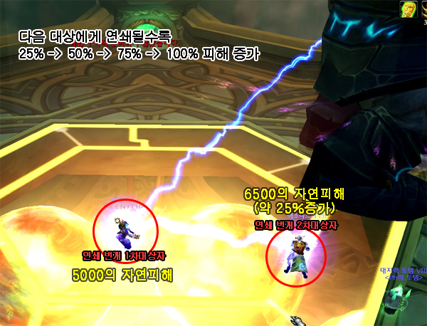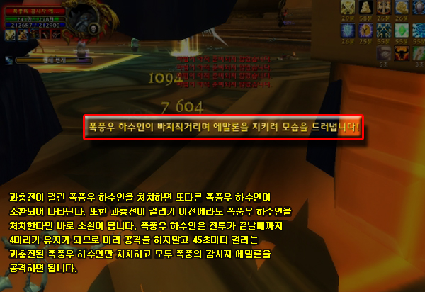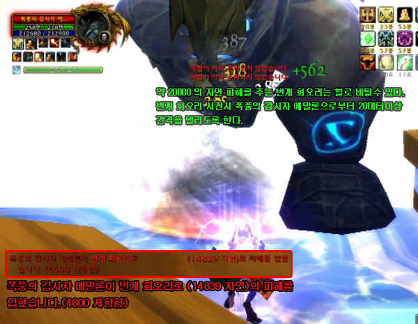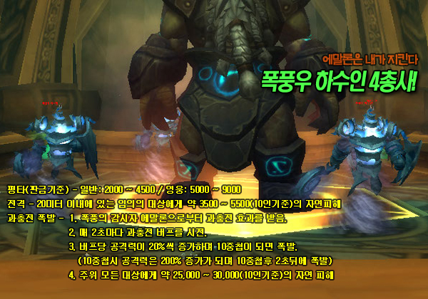 폭풍의 감시자 에말론의 사용스킬에 주의하면서 공격을 합니다. 연쇄 번개 -> 연쇄 번개 -> 번개 회오리 -> 연쇄 번개 -> 과충전 -> 연쇄 번개 -> 번개 회오리 연쇄 번개의 피해를 줄이기 위해 공격대원간 10미터의 거리유지는 필수입니다. 번개 회오리시 근접딜러는 폭풍의 감시자 에말론으로부터 20미터이상 떨어져야 합니다. 폭풍의 감시자 에말론이 과충전을 사용하면 모든 딜러는 과충전된 폭풍우 하수인을 찾아 10중첩이 되기 전에 처치해야 합니다. (에말론에게 마나 연소를 사용하여 에말론의 마나를 0으로 만든다면 연쇄 번개를 사용하지 않습니다.)