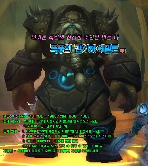 기존의 아카본 석실에 추가가 된 것이기에 몬스터 배치는 기존과 크게 다르지가 않습니다. 폭풍의 감시자 에말론과 에말론에게 가는 길에 있는 폭풍우 수호병 2마리 만이 추가가 되어 크게 어려움은 없어 보입니다.