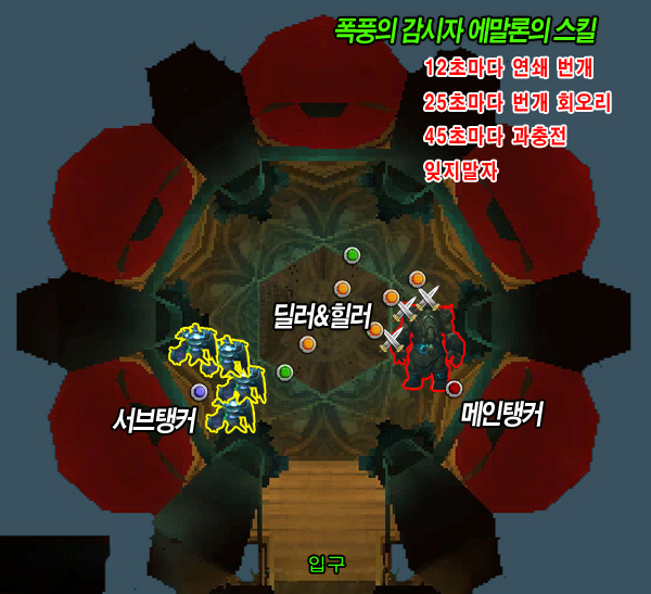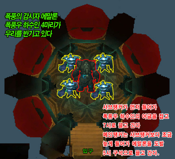 폭풍의 감시자 에말론과 폭풍우 하수인 4마리가 있습니다. 4마리의 광역어글을 획득해야 하므로 서브탱커가 먼저 들어가서 어글을 획득하고 7시로 폭풍우 하수인 4마리를 끌고 갑니다. 메인탱커는 서브탱커보다 조금 늦게 들어가면서 폭풍의 감시자 에말론에게 도발스킬을 사용하여 어글을 획득한 후 5시 구석으로 끌고가 탱킹을 시작합니다.