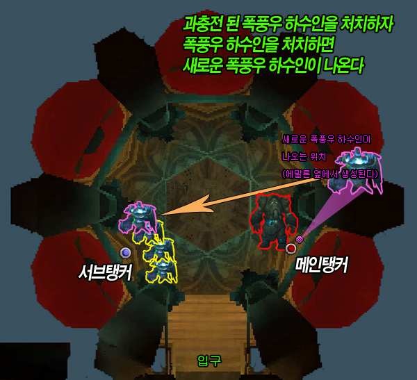 바위 감시자 아카본을 공략할 때와는 사뭇 다르게 서브탱커의 역할이 매우 중요합니다. 서브탱커는 전투가 끝날 때까지 폭풍우 하수인 4마리를 지속적으로 붙들고 있어야 하며, 과충전이 걸린 폭풍우 하수인을 빠르게 찾아 공대원들이 처치할 수 있도록 알려야 합니다.