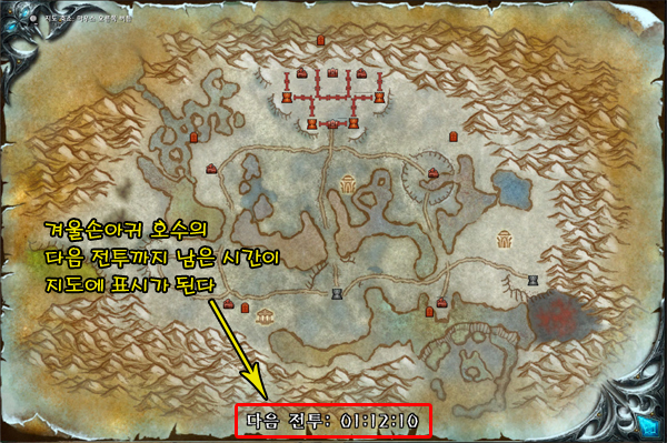 지금까지는 각 진영의 겨울손아귀 전투마법사에게 말을 걸어 다음 겨울손아귀 호수 전투시간을 확인하였습니다. 그러나 3.1패치 이후에는 어디서든 겨울손아귀 호수 지도만 펼치면 다음 전투까지의 남은 시간을 확인할 수가 있습니다.
