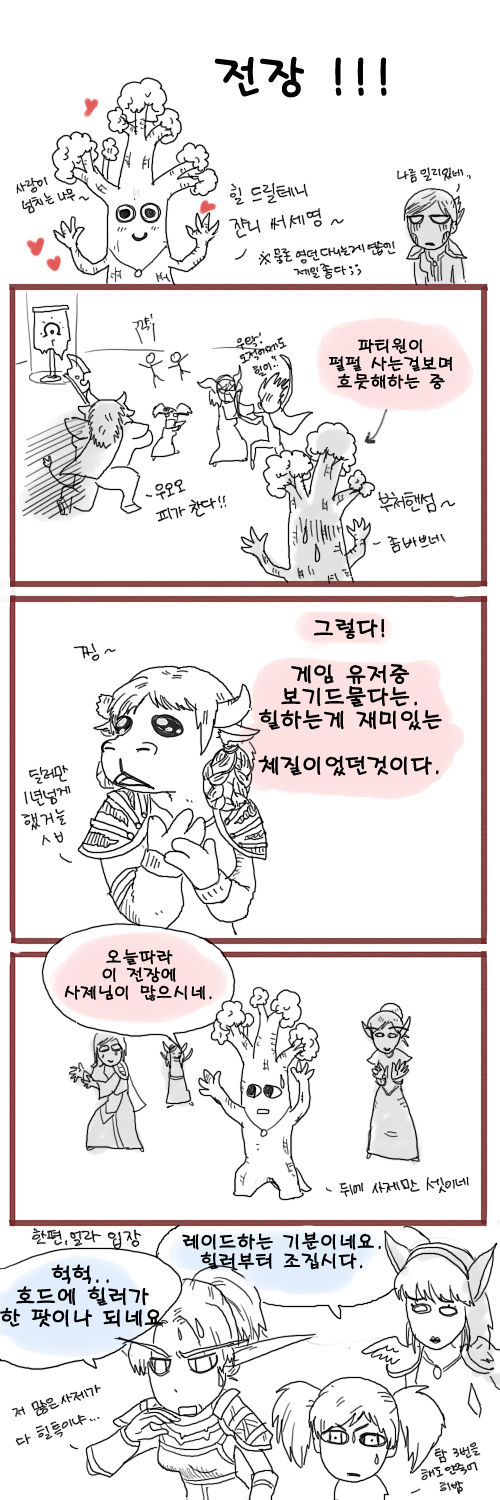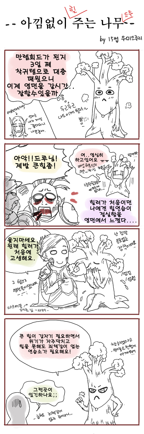 듀로우미님의 작품을 보면서 힐러를 하던 생각이 들었습니다. 처음 힐러를 할때 제대로 못해서 파티와 공격대를 많이 전멸시켰던 기억이 생각나 마음이 아프네요. 전장에서의 재미난 에피소드가 녹아있는 `아낌없이 주는 나무`가 이번 주 1위를 차지하였습니다.