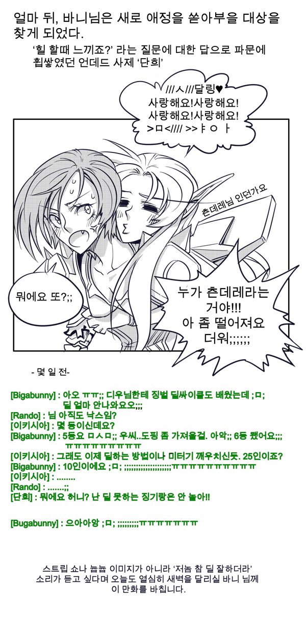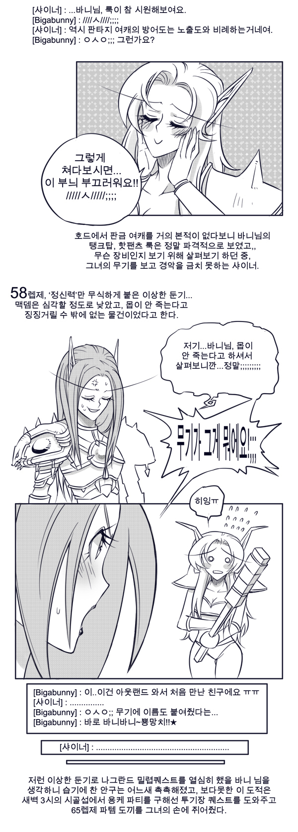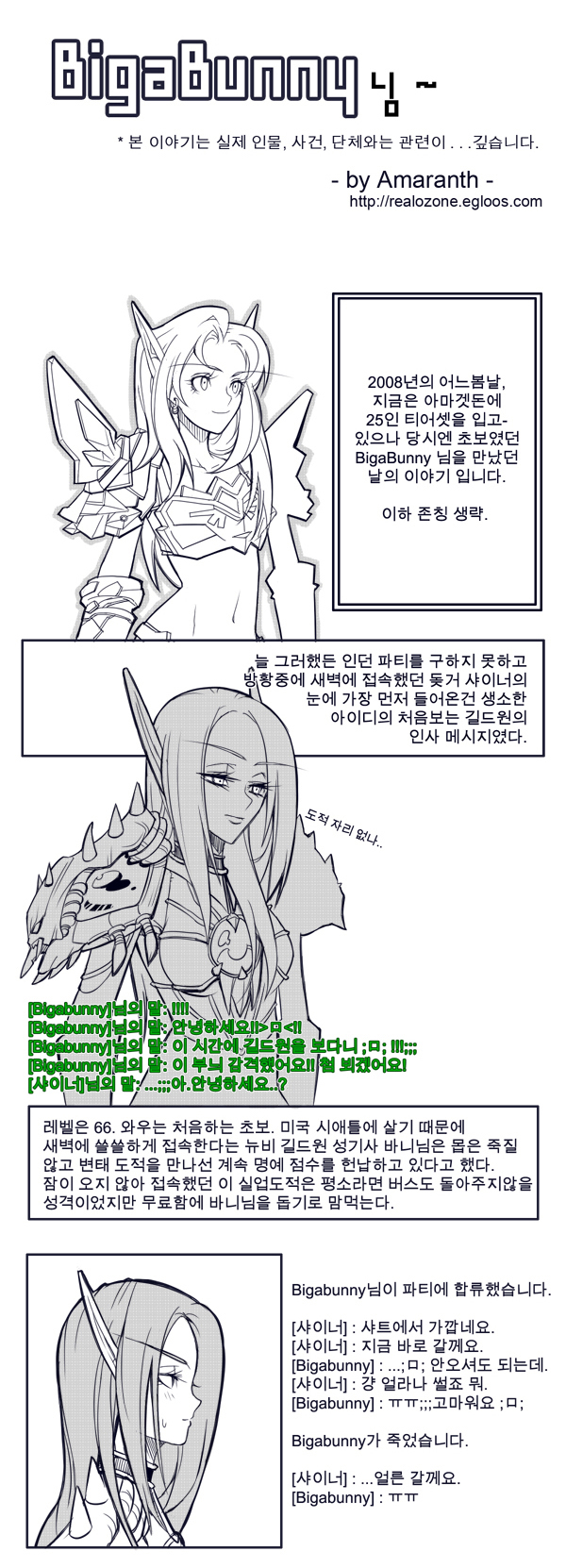 미국 시애틀에서 와우를 즐기시는 BigaBunny님과의 재미난 에피소드를 그려주셨네요. 와우는 룩이 최고여야 한다는 생각을 가진 저로서는 왠지 모르게 BigaBunny님의 마음을 충분히 이해 할 수가 있을 것 같습니다. BigaBunny님의 다음 이야기를 기다리며 감상해보시기 바랍니다.