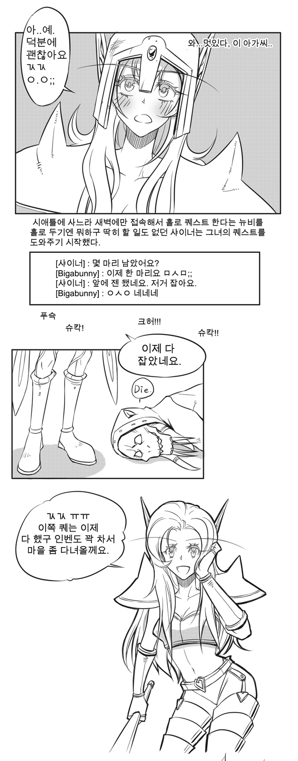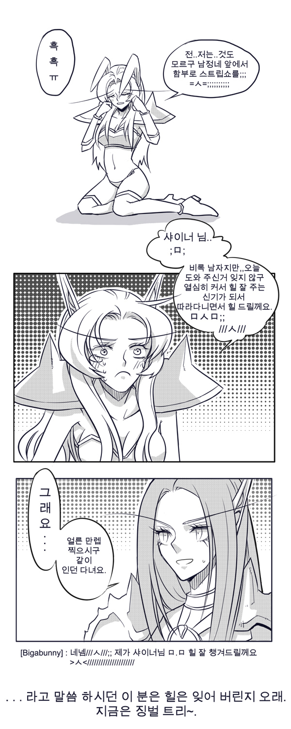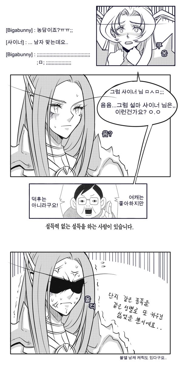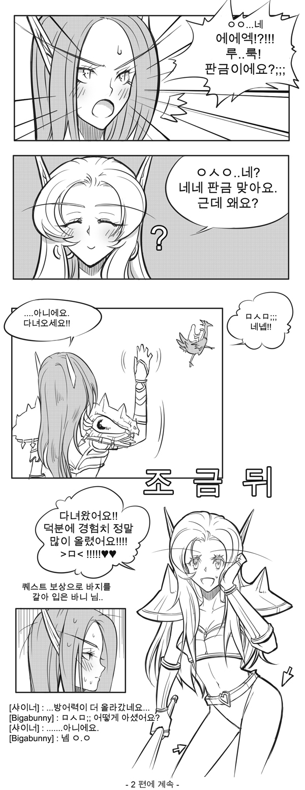 미국 시애틀에서 와우를 즐기시는 BigaBunny님과의 재미난 에피소드를 그려주셨네요. 와우는 룩이 최고여야 한다는 생각을 가진 저로서는 왠지 모르게 BigaBunny님의 마음을 충분히 이해 할 수가 있을 것 같습니다. BigaBunny님의 다음 이야기를 기다리며 감상해보시기 바랍니다.