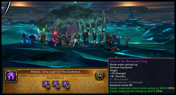 10인과 25인간의 도전모드는 간혹 극명한 난이도 차이를 보이고 있기도 한데요. 낙스라마스에서 10인에서도 어려웠지만 25인은 더더욱 어려웠던 `불사신` 업적은 울두아르에 와서는 네임드 별로 카운트되는 바람에 많이 너프된 느낌입니다. 하지만 네임드별 도전모드로만 놓고 보자면 아우리아야 하나만으로도 흑요석 성소와 비슷한 느낌을 주고, 많은 네임드 몬스터들의 하드모드가 낙스라마스때의 장난스러움과는 차원이 다르죠.